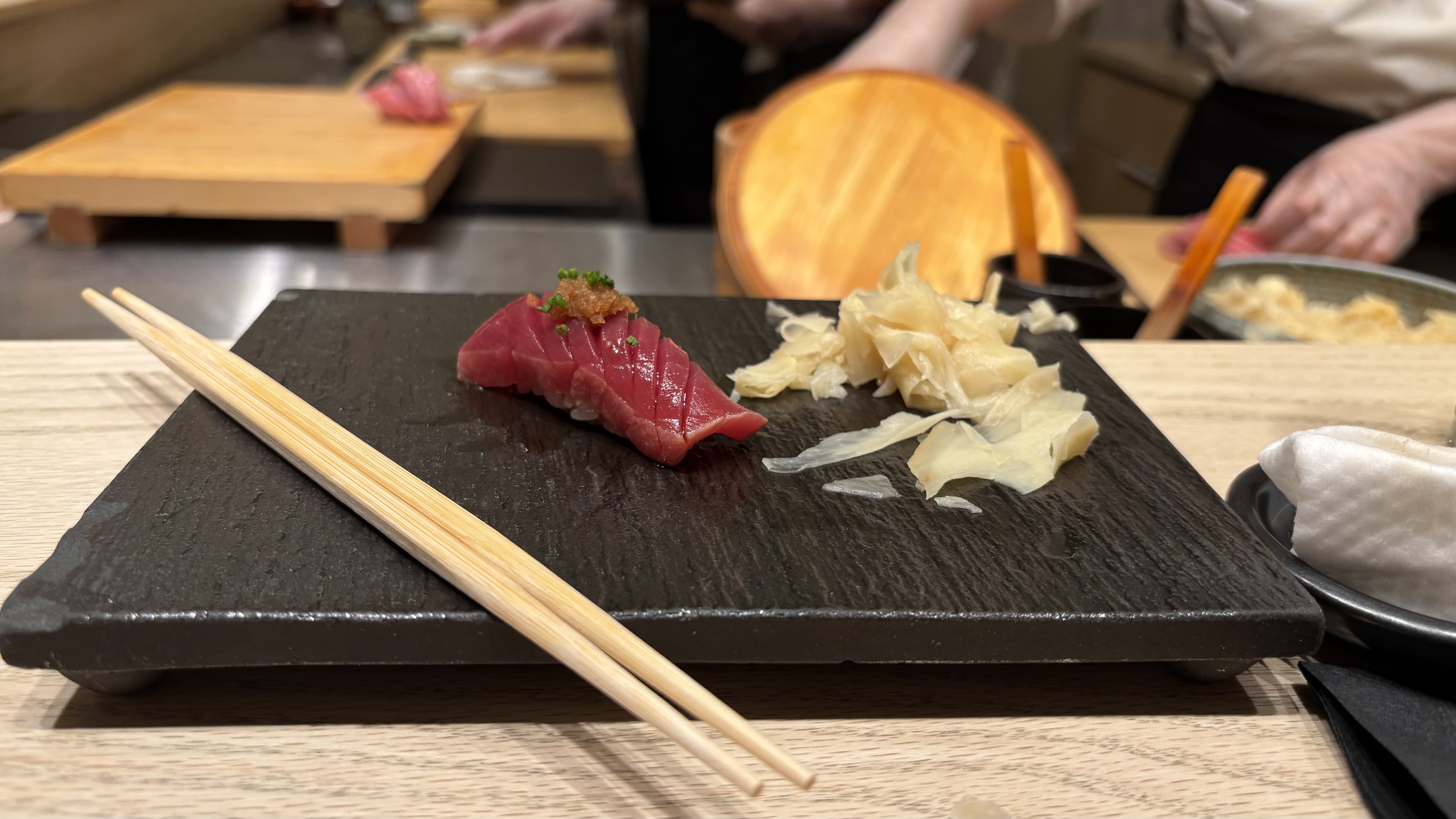 Lottie and I were nervous, despite the fact that we grew up eating lots of Japanese food–our dad is half Japanese, and we've been eating Americanized sushi our whole lives. However, we ate every bit of sushi they gave us, and we loved it! Some of them I had to eat in two bites because of the texture of the fish and the size of the piece, and I’m pretty sure Lottie had to eat all of them in two or more bites because she has a small mouth. Luckily, at this omakase restaurant, they don't judge too harshly if you eat it in two bites. I also liked every piece I tried, which surprised me! There was one I liked less than all the others though, and that was this one: